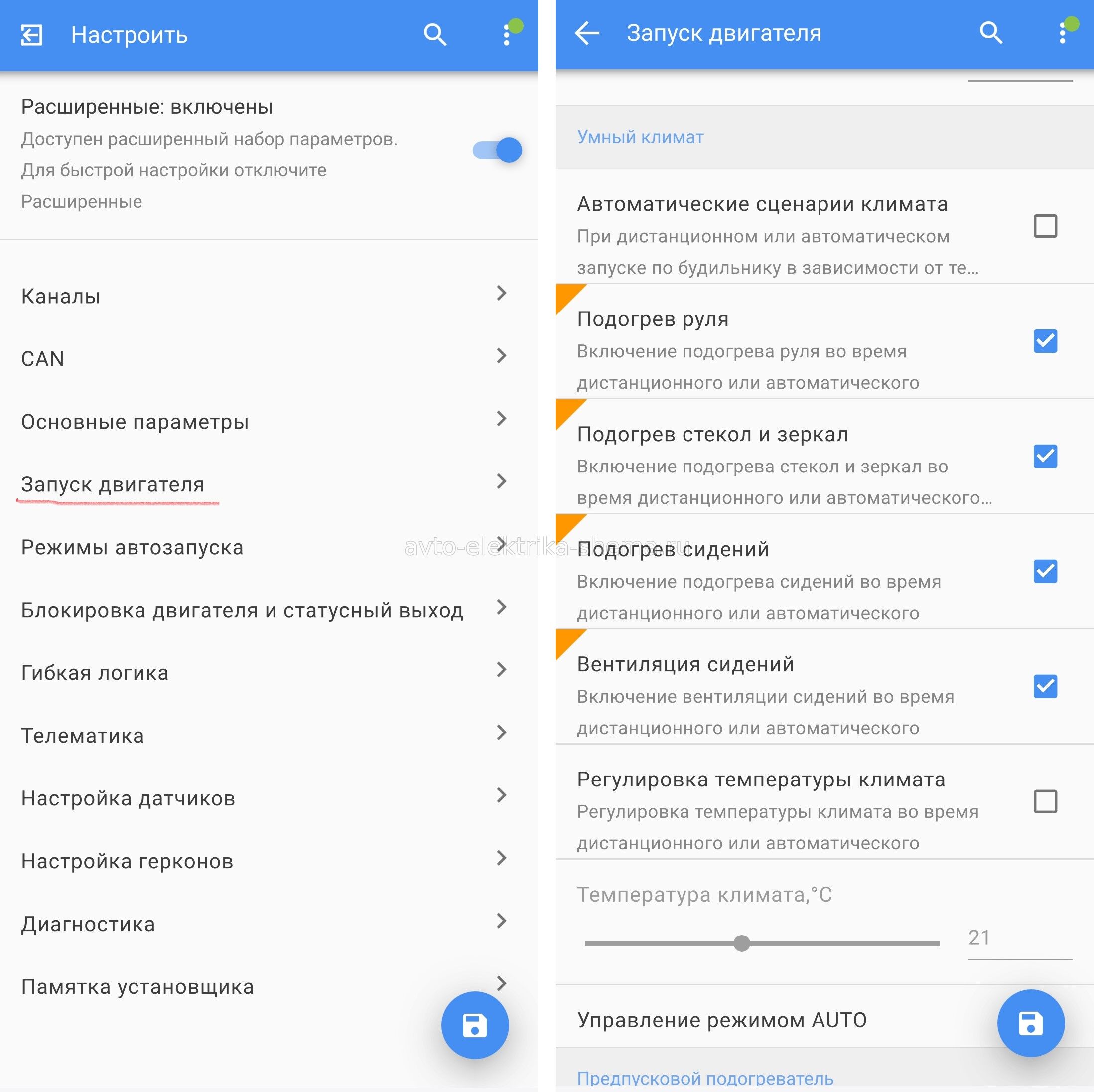 Названия выходов блока можно назвать только Подогрев руля, Подогрев стекол и зеркал, Подогрев сидений, Вентиляция сидений, эти же названия будут у иконок в приложении. Других пока нет, но хотелось бы чтобы появилась например Вентилятор отопителя, чтобы не оставлять вентилятор на первом положении, хотя у меня на вентилятор отопителя стоит реле параллельно между 0 и 1, подключенное к выходу с названием Вентиляция сидений, которых у меня нет, но зато на иконке изображён вентилятор с сидением, пускай будет хоть так. Если оставлять постоянно вентилятор отопителя в первом положении, то в период прогрева например по температуре ночью, будет прогреваться и салон, что требует больше времени на прогрев двигателя. С Умным комфортом можно включать вентилятор перед утренним дистанционным запуском. С каналами разобрались, теперь поставим нужные флажки в разделе Запуск двигателя.