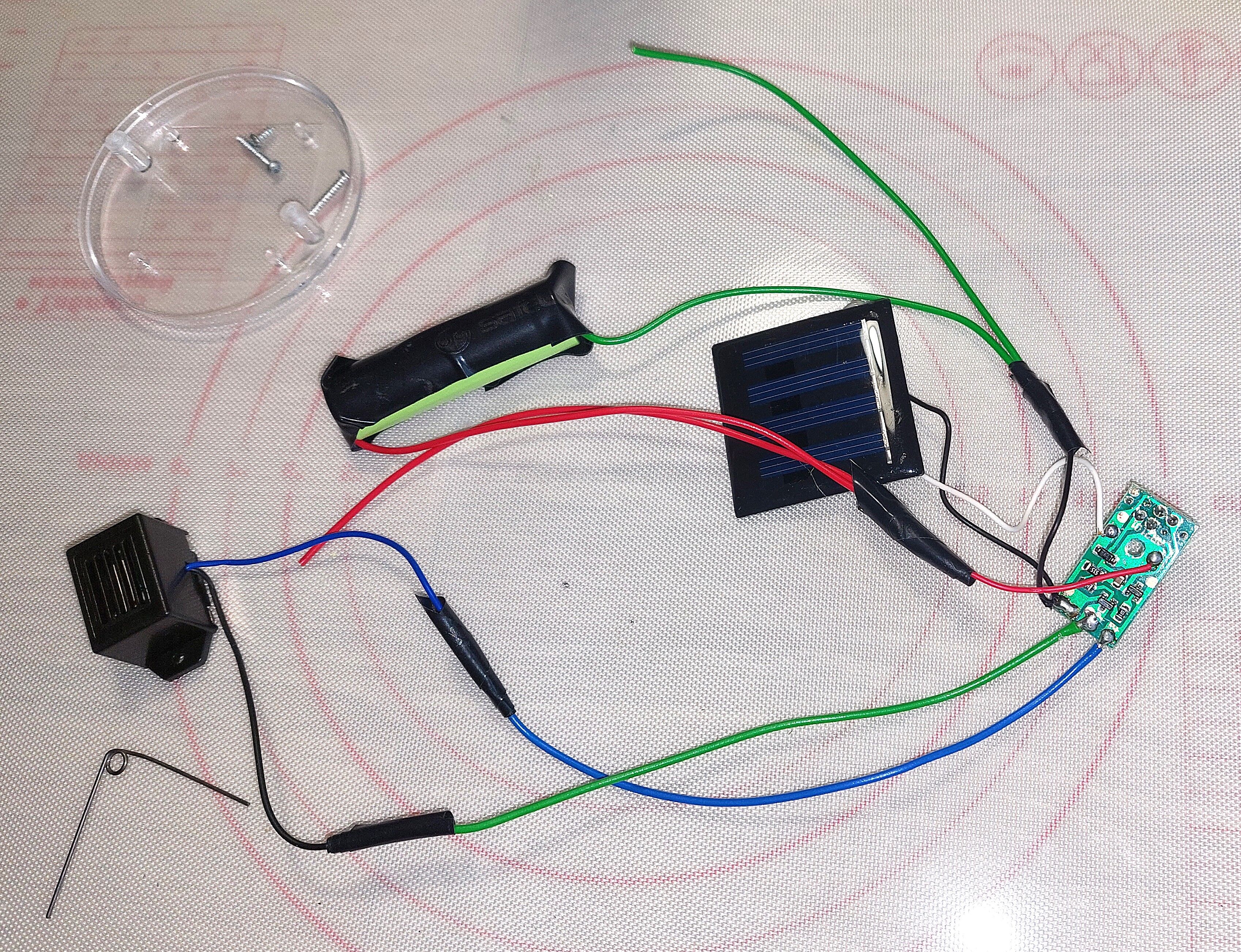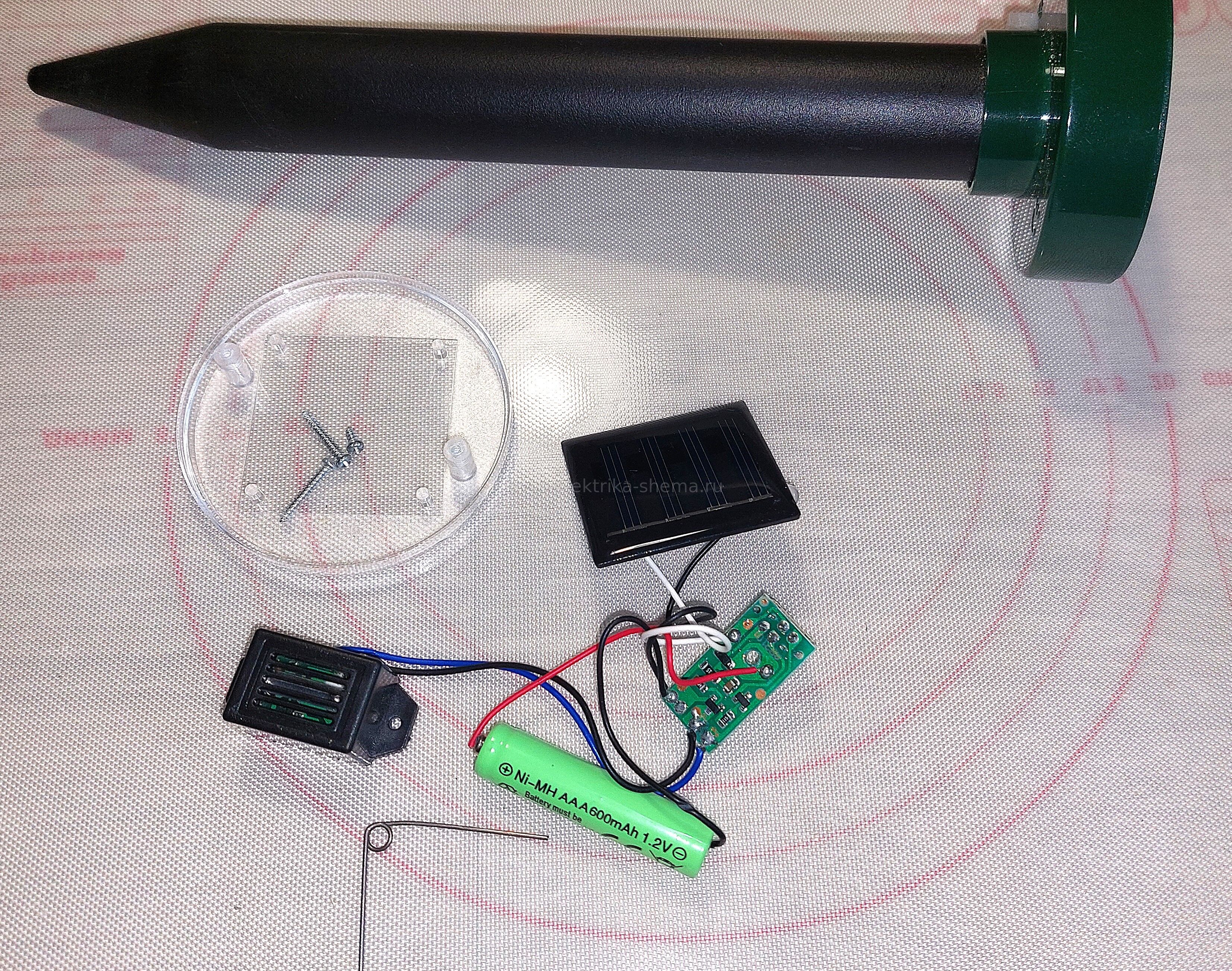 Осенью на даче кроты сильно нарыли участок, даже тропинки. Поискав в интернет магазинах, нашёл такой вариант с солнечными батареями, который периодически издаёт звуковые вибрации с частотой от 400 до 1000 Гц. В комплекте было 4 отпугивателя. По инструкции написано что для лучшего результата нужно их устанавливать не более 10 метров друг от друга. Отпугиватель вставляется в землю, а на поверхности остаётся только верхняя часть на высоте пару сантиметров, включив выключатель на корпусе отпугиватель начинает издавать звук каждые 20 секунд. Внутри отпугивателя находится NI-MH аккумулятор, который подзаряжается от солнца. Установил все отпугиватели и включил, всё как по инструкции. Они издавали противный звук, который надоест и людям, не знаю как кротам, так что близко к соседям лучше не ставить, мало ли нервы не выдержат. Эффект должен достигнуть через 7-14 дней непрерывного использования, чтобы кроты покинули территорию. Осенью солнце светит мало, да ещё и пасмурные дни, отпугиватели отработали только один день и замолкли, потом я ходил и вытирал с них капли воды и включал по новой и всё повторялось каждый день, внутри стёкла ещё также запотевали, кроты в этих местах не копали новых холмов, зато они появлялись в других местах совсем рядом, наверно в момент когда они затихали. Когда наступили заморозки я забрал эти отпугиватели домой на изучение и доработку по возможности. Давайте посмотрим из чего они состоят.
