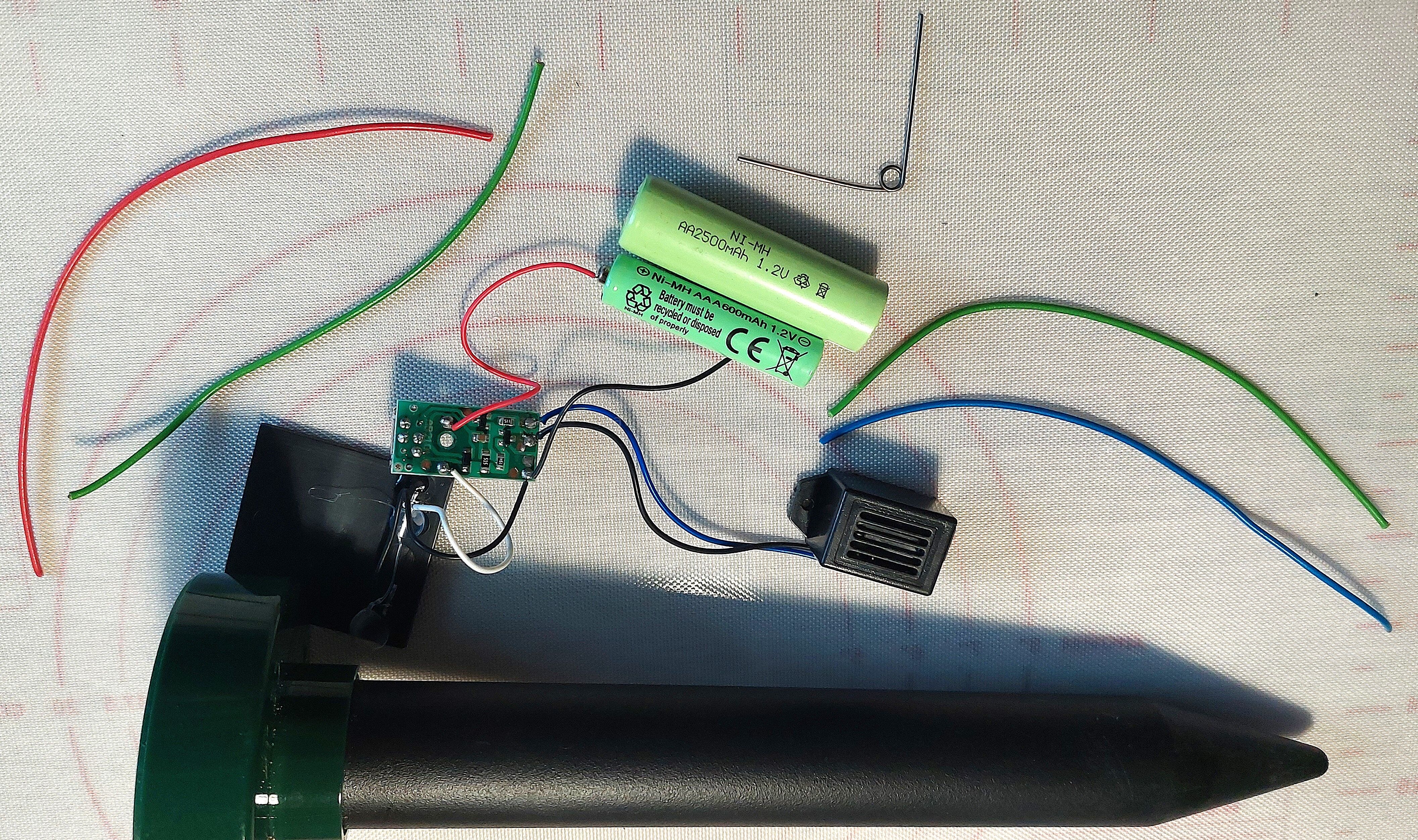 Купил новые аккумуляторы с настоящей ёмкостью в 2500 мАч, удлинил провода чтобы опустить звуковой излучатель ниже в трубку, а над ним будет аккумулятор.