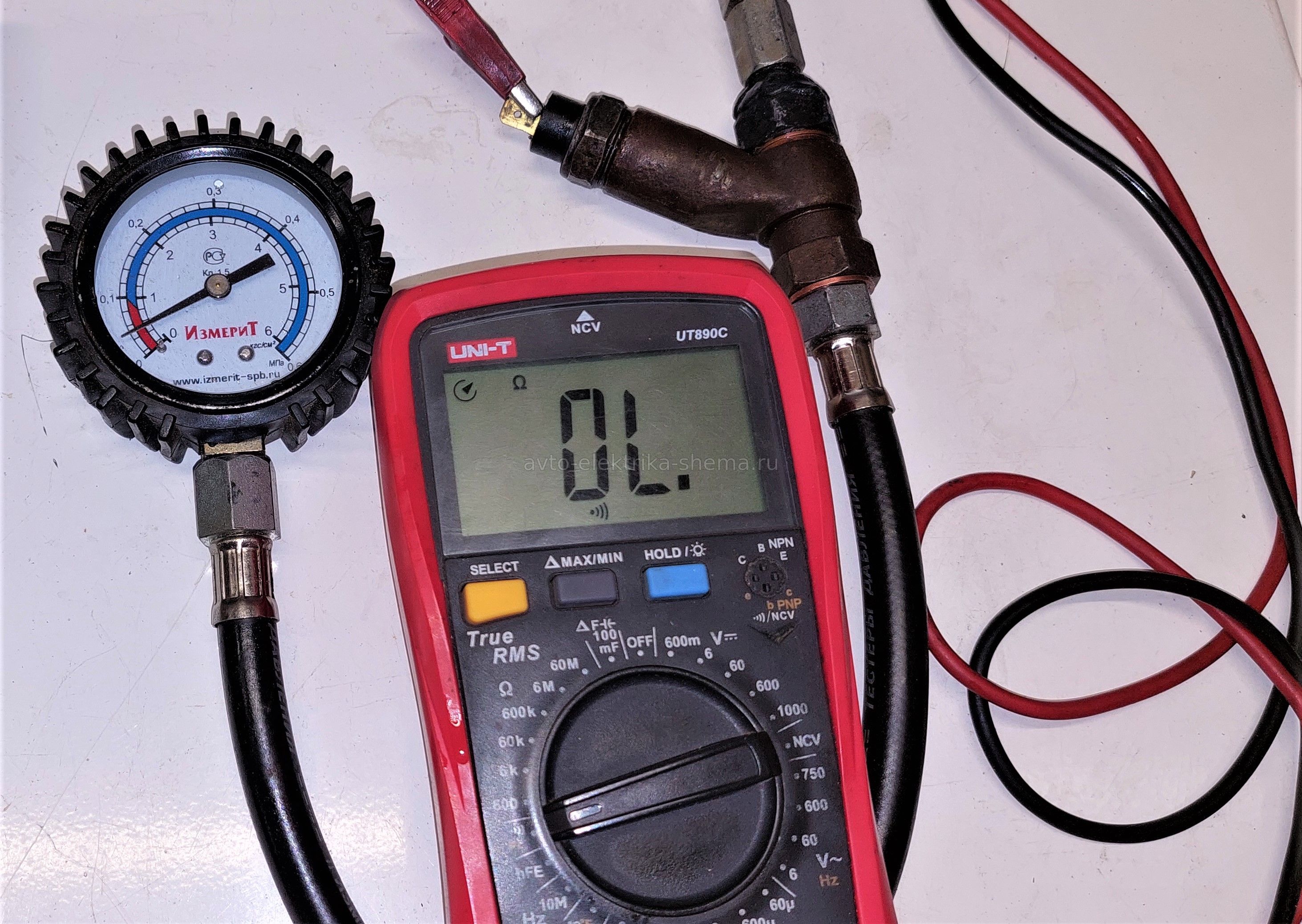 Первым испытуемым датчиком будет от классики. Шприцом можно плавно накачивать давление по делениям манометра. Чтобы стравить давление я слегка откручивал манометр и снова затягивал, вытекает масла не много по чайной ложке. Датчик отработал при давлении 0,5 кг/см2, рабочий. Такой датчик я проверял как то воздухом, способ тоже рабочий.
