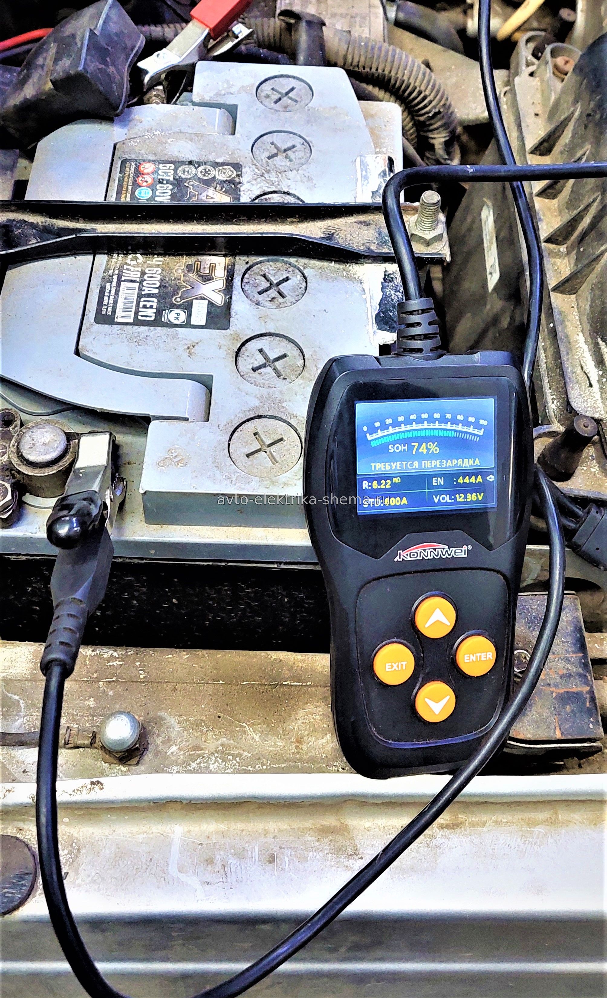С приходом холодов всё больше водителей беспокоятся за успешный запуск двигателя и приезжают в сервис, чтобы им проверили аккумулятор и стартёр. Но бывают ещё проблемы с контактами связующих проводов между стартёром и АКБ. В этом случае обычно используют мультиметр и измеряют падение напряжения в момент прокрутки стартёром. Мне пришла идея проверять эти контакты прибором для теста ёмкости АКБ, так как этот прибор измеряет не только пусковой ток, но и сопротивление, причём в мили омах, обычный мультиметр может только измерить десятые доли ома. Для подтверждения теории, проведу измерения на четырёх автомобилях с разным состоянием аккумуляторов. Измерение сопротивления массы будет осуществляться минусовым крокодилом прибора, прицепленного к корпусу двигателя, а плюсовой останется на клемме АКБ.