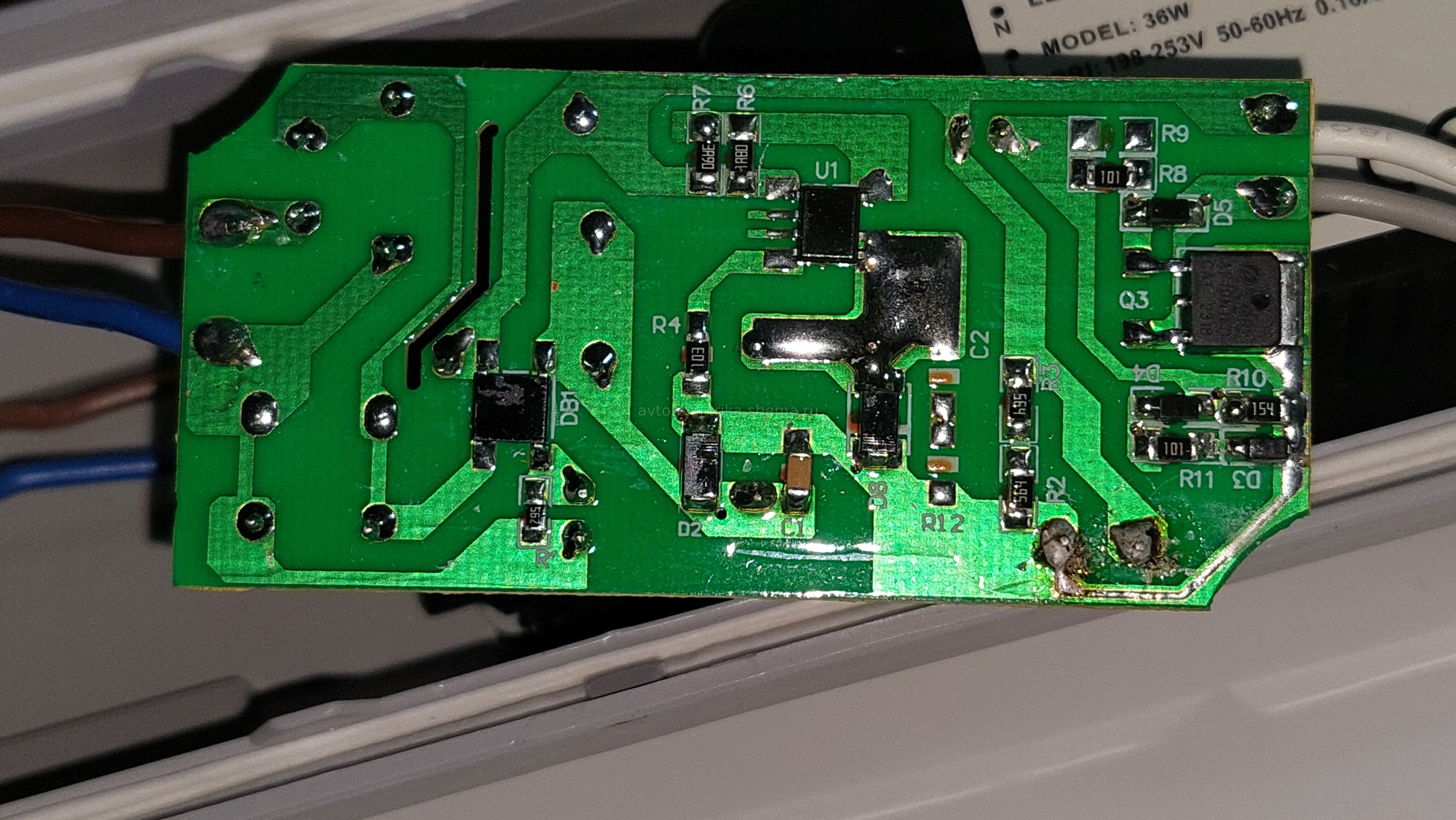 В результате на выходе драйвера с подключенными светодиодами получилось 411 вольт, ток не замерял. По яркости мне было достаточно, если чуть уменьшить сопротивление, то будет ещё ярче, но может опять начать срабатывать защита. При первом включении светильник запускается со второго мигания, и так при каждом включении. Протестировал их несколько дней, всё исправно работает. Смотрите видеоролик по ремонту такого светильника.