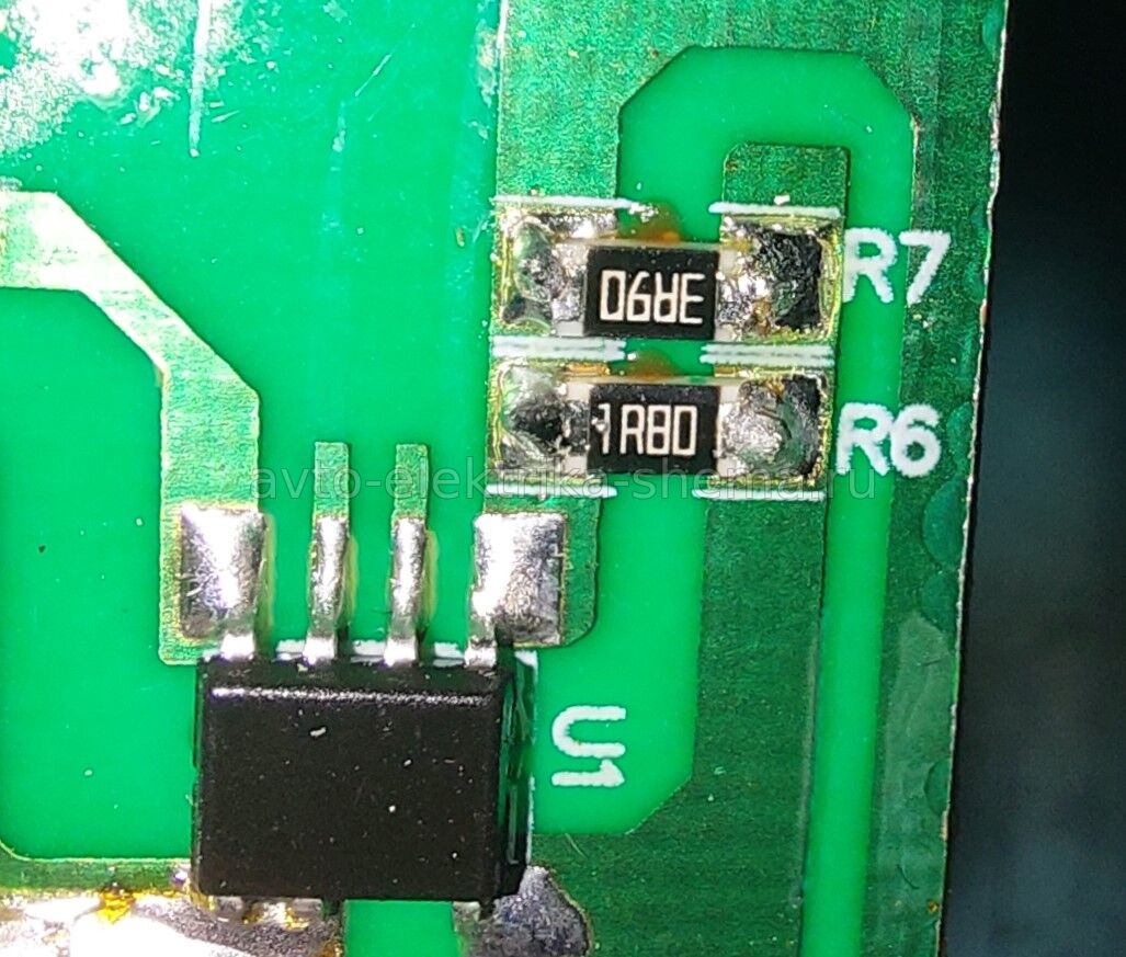 На фото выше показаны два сопротивления, соединённых параллельно R6 и R7, нужно убрать их и припаять одно новое на 3 Ом, либо собрать такое из двух.