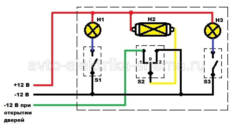 На схеме обозначил: H1, H2, H3 - лампы; S1, S3 - выключатели боковых ламп; S2 - переключатель центральной лампы. Если просто поменять питающие провода местами (красный с чёрным), то светильник будет работать только до того момента, пока переключатель S2 - не переключат в положение 1 и откроют дверь, в этот момент перегорит предохранитель в лучшем случае, а вот если зелёным проводом управляет электронный блок, то можно повредить электронику в нём, лучше не проверять. Поэтому нужно сделать так, чтобы зелёный провод включал маленькую релюшку, которую мы добавим в следующую схему: